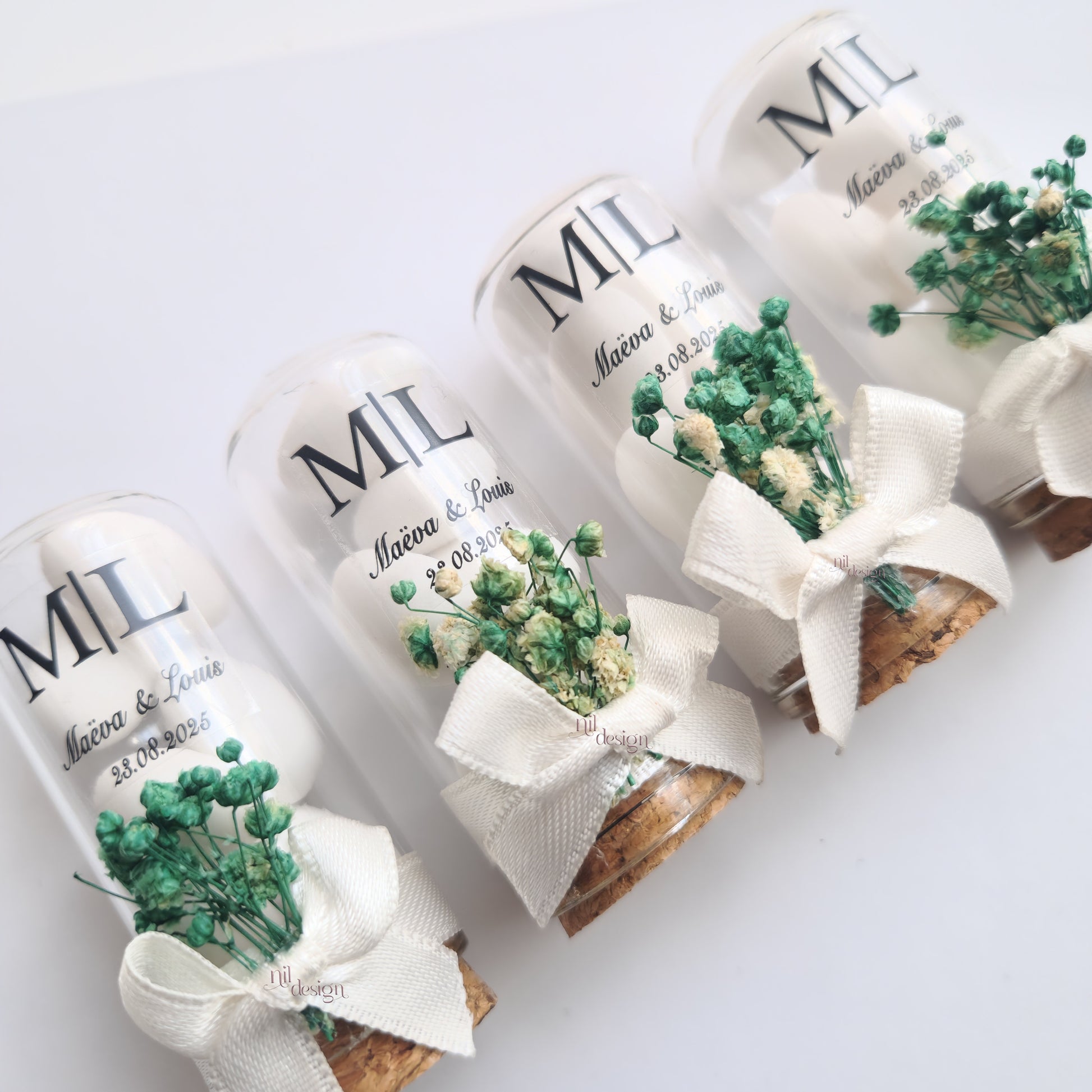 Give a refined gift with this glass vial filled with sugared almonds and decorated with dried flowers.