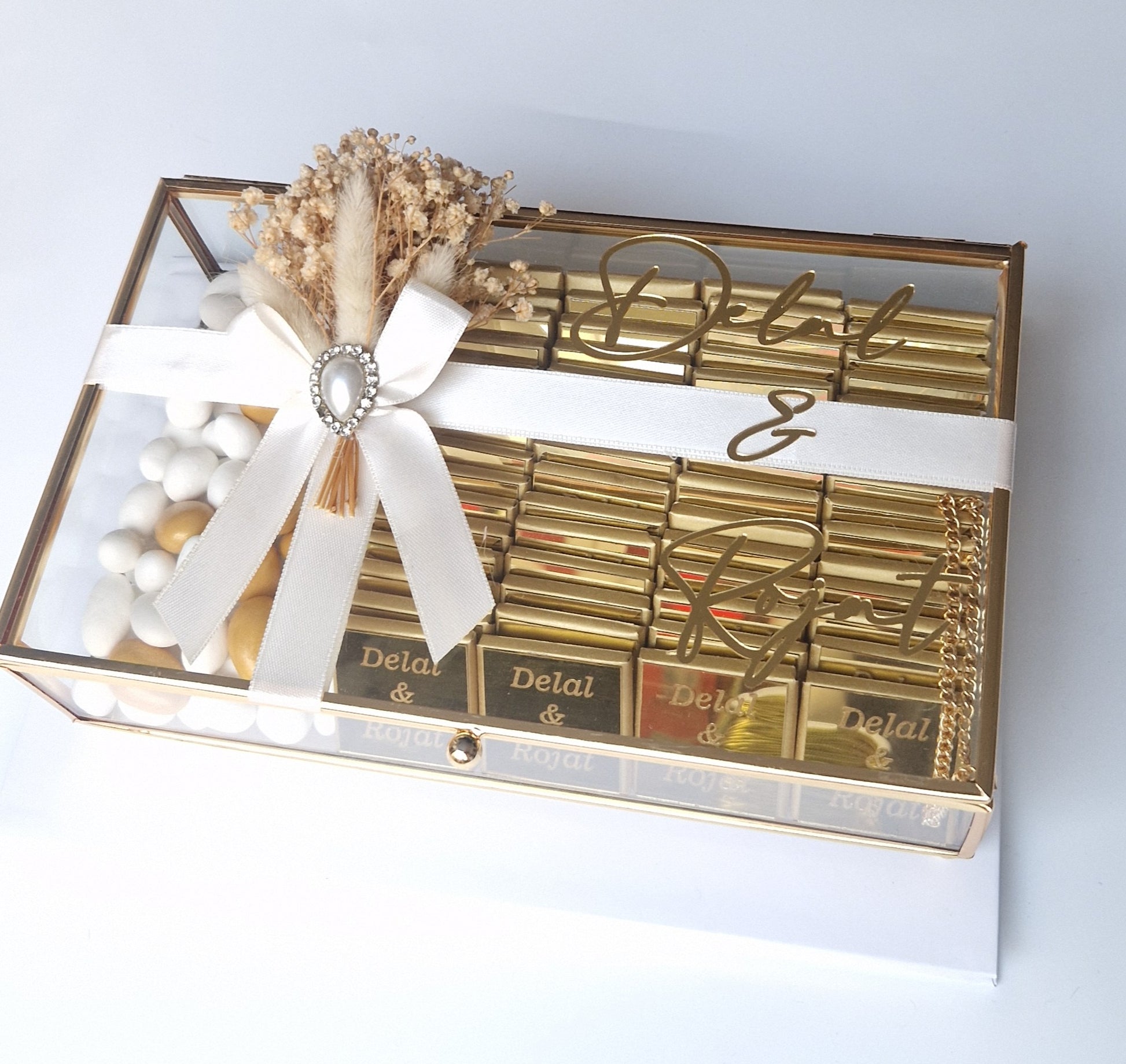 • Le petit coffret contient 60 chocolats accompagnés de dragées savoureuses