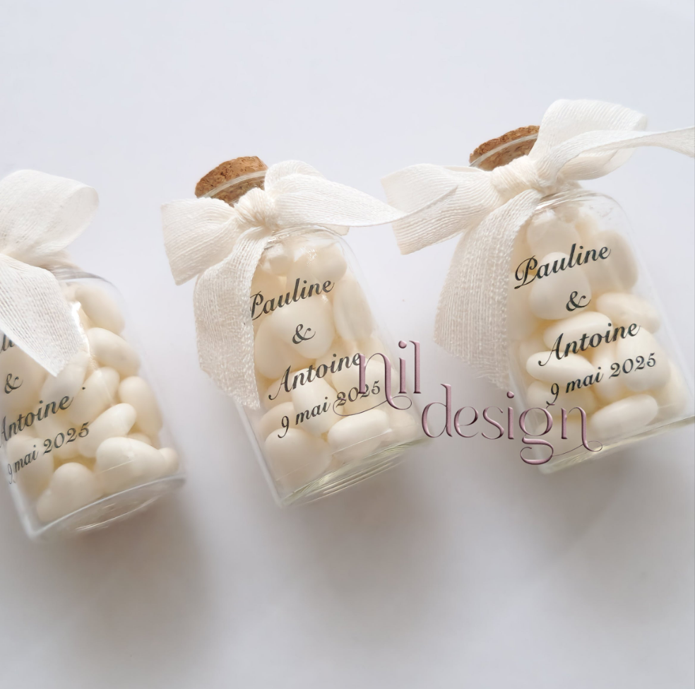 A charming, ready-to-give gift, combining the beauty of glass and the sweetness of white candies.