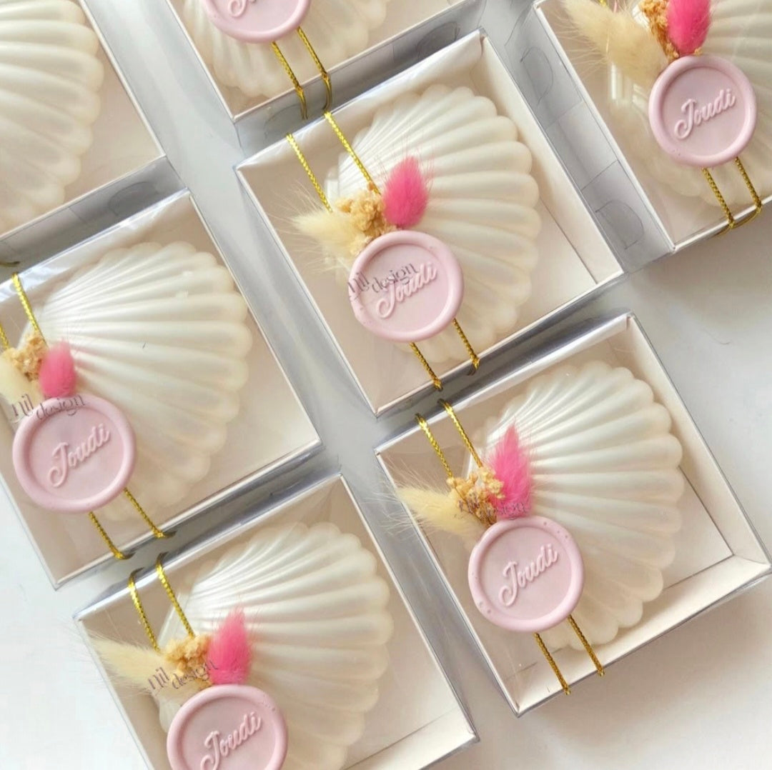 Une bougie en forme de coquillage, glissée dans une boîte raffinée et scellée d’un cachet de cire. Un détail qui fait toute la différence pour vos événements.