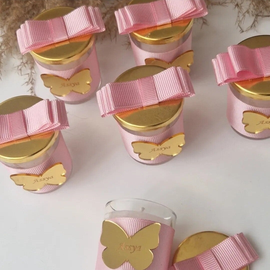 Sorprenda a sus invitados con una elegante vela en recipiente de cristal, perfecta para añadir un toque de refinamiento a sus eventos.