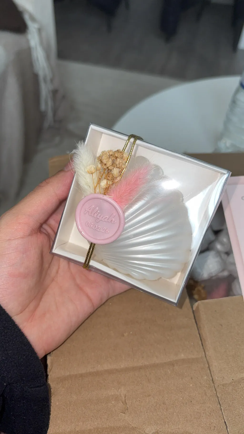 Une bougie en forme de coquillage, glissée dans une boîte raffinée et scellée d’un cachet de cire. Un détail qui fait toute la différence pour vos événements.