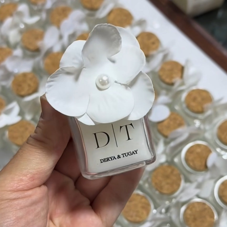 Surprenez vos invités avec cette bougie raffinée, décorée d’une fleur blanche élégante et personnalisée aux prénoms des mariés. Un souvenir chic et intemporel à offrir pour illuminer vos plus beaux événements.