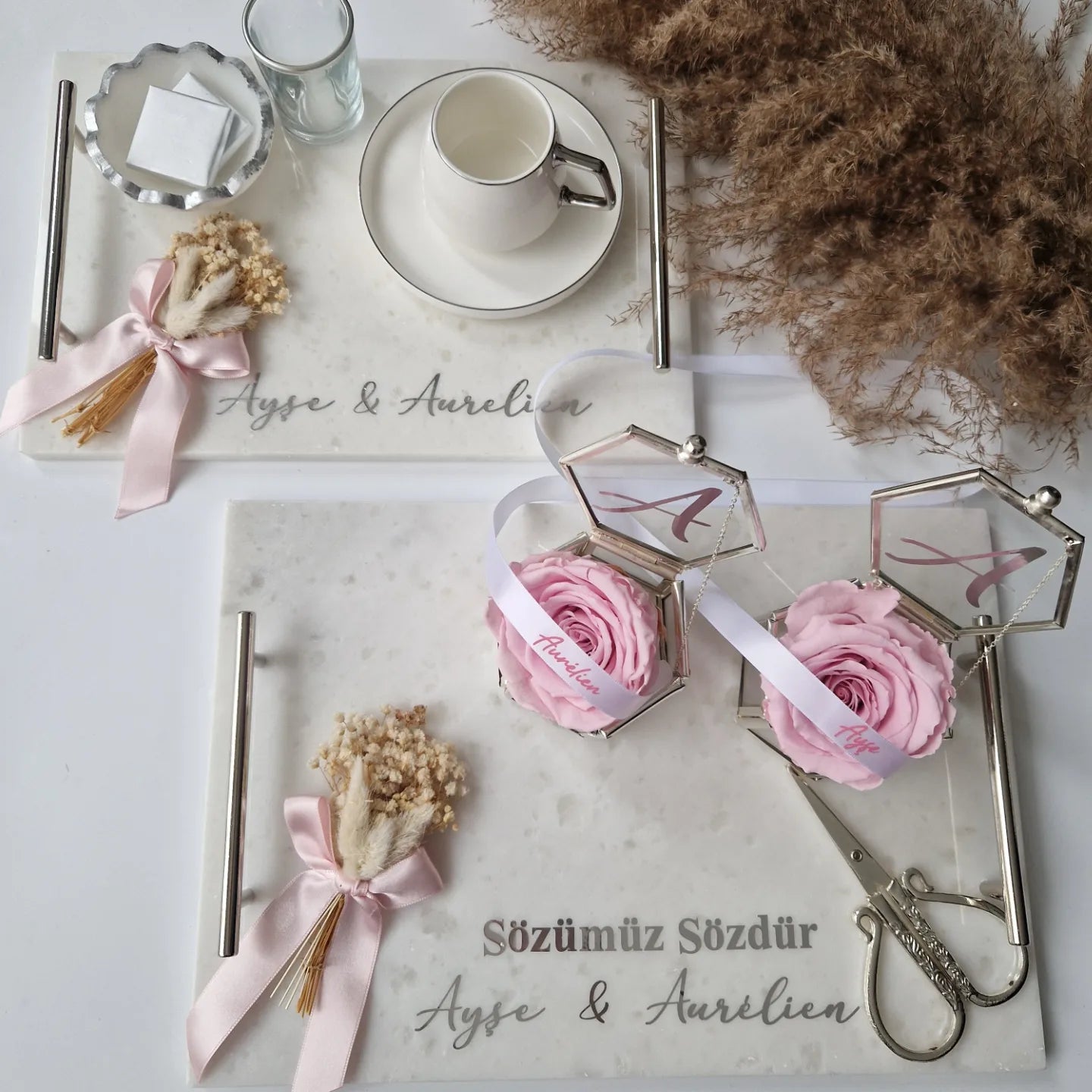 Plateau d'alliances & café avec roses éternelles Argenté